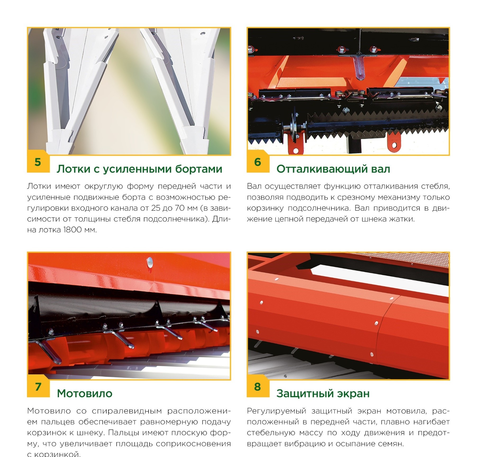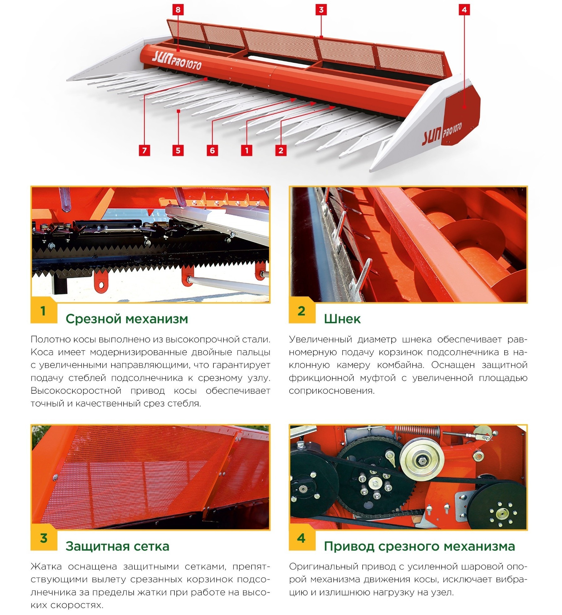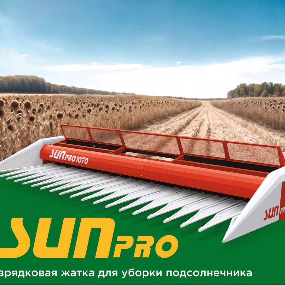 Безрядковая жатка SUNPRO – это универсальное решение для уборки разноярусного подсолнечника, удовлетворит запросы как владельцев комбайнов отечественного производства, так и импортного. Высокая вариативность настройки жатки позволяет убирать все сорта подсолнечника независимо от климатических зон произрастания. Оптимизированная система отделения корзинок жатки исключает попадание стебельной массы в комбайн и обеспечивает высокую скорость уборки урожая. Технология безрядковой уборки за счет широкого захвата позволяет сократить время уборки, не учитывая направленность и ширину посева. Жатка доступна в двух модификациях: 1070 - ширина захвата 7 метров; 1270 - ширина захвата 8,4 метра, 1470 - ширина захвата 9,8 метра, 1670 - ширина захвата 11,2 метра. Жатка агрегатируется с любым комбайном.