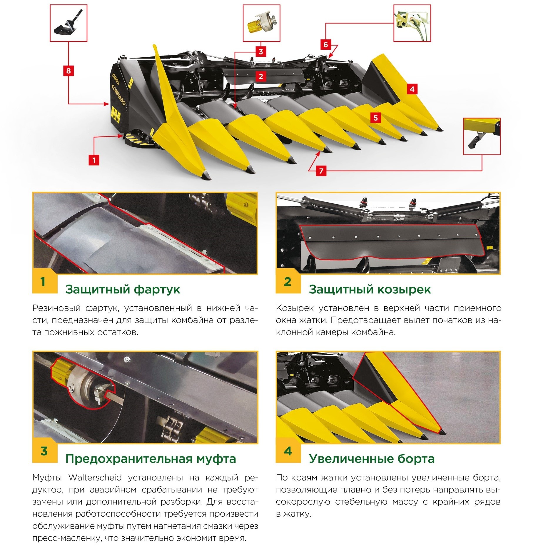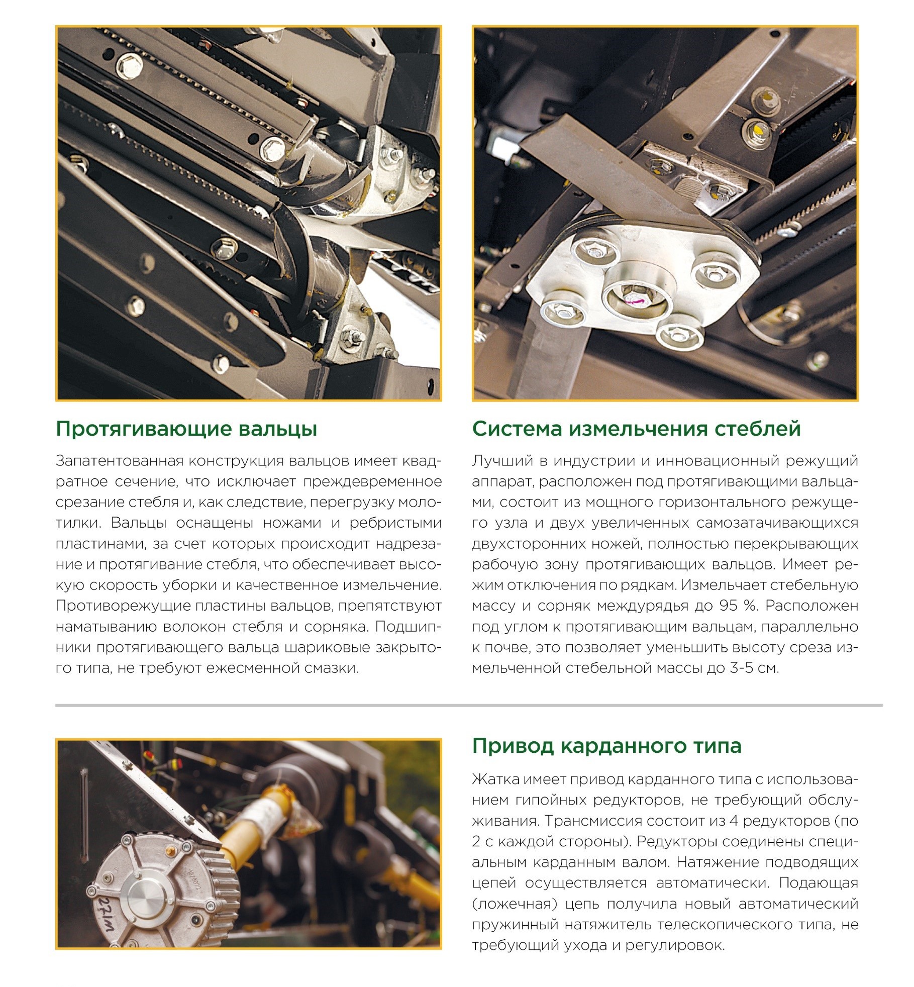 - Продуманная конструкция жатки обеспечивающая свободный доступ к узлам позволяет минимизировать затраты до 3-х раз на техническое обслуживание.