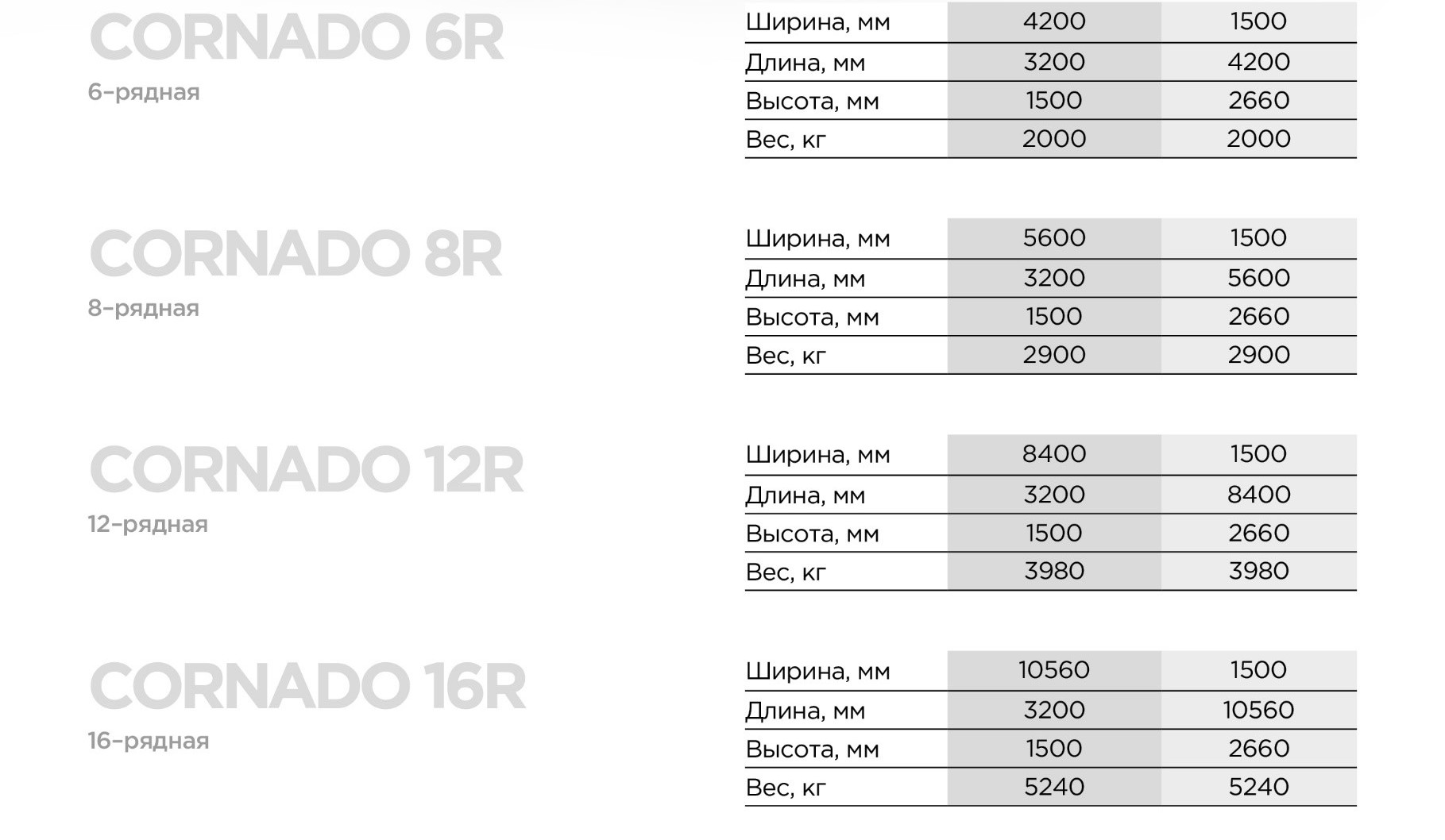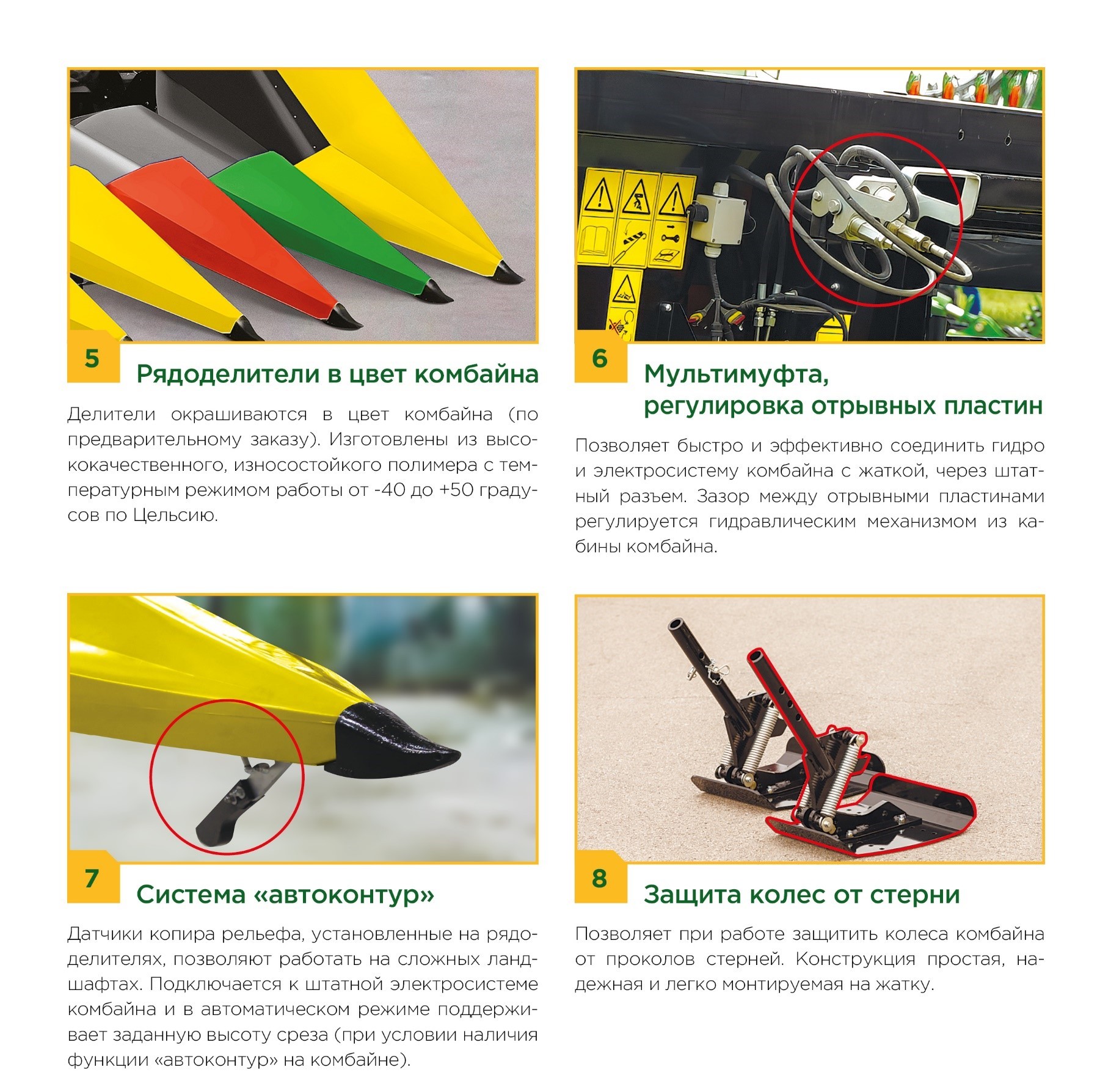 Жатка доступна с жесткой или складной рамой в 6-ти, 8-ми, 12-ти, 16-ти рядном исполнении, агрегатируется на любой тип/марку комбаина.